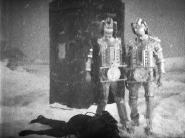 That snowscape though… Now as far as we know, William Hartnell’s Doctor was the first, and thus the first body of his first regeneration cycle. Fans of the newer form of Doctor Who may not be aware that the first regeneration took place at the end of the Doctor’s first encounter with the Cybermen. The last episode of The Tenth Planet ended with the Doctor makign it back into the TARDIS with his companions, Ben and Polly, banging on the TARDIS doors in the snowfall, to gain entry to the time capsule… the Doctor found enough energy to get the doors open only to collapse and regenerate, bringing forth the second doctor in the form of Patrick Troughton.